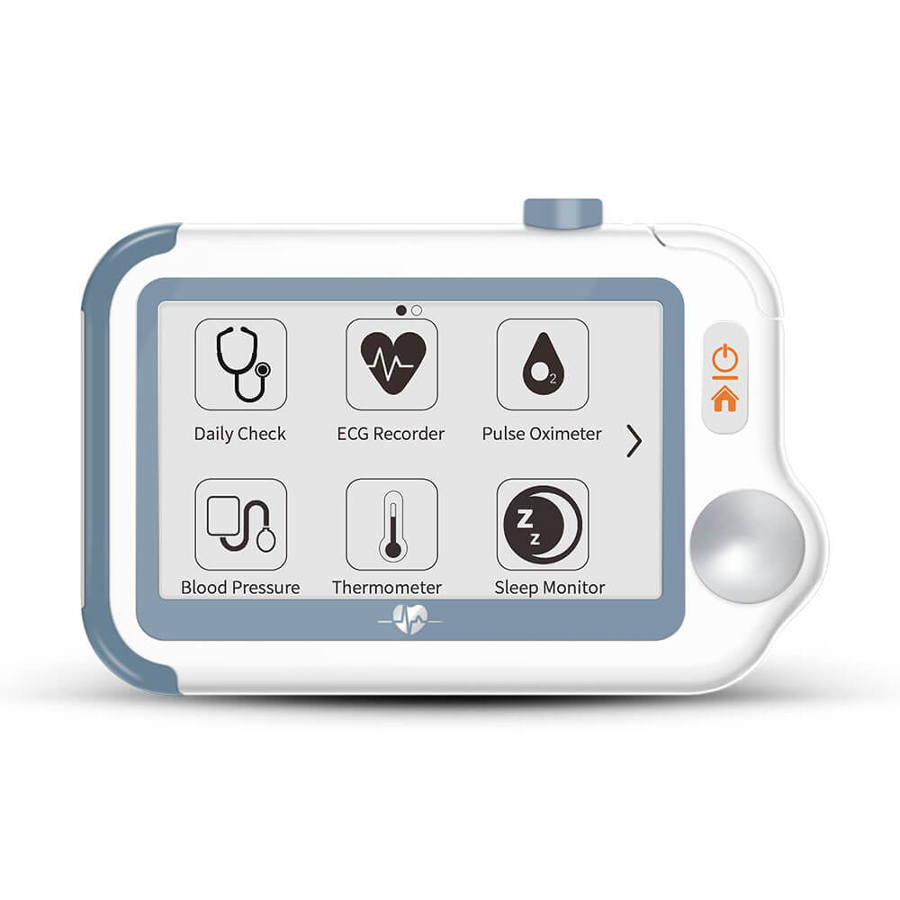 ALL-IN-ONE - Integrates ECG, ECG Holter, SpO2 (oxygen saturation), PI (perfusion index), NIBP (Non-Invasive Blood Pressure), body temperature, and pedometer in one device with a palm-sized design.